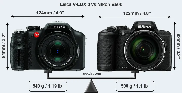The physical size and weight of the Leica V-LUX 3 and the Nikon B600 are illustrated in the side-by-side display below. The two cameras are presented according to their relative size. Three consecutive perspectives from the front, the top, and the back are available. All width, height and depth dimensions are rounded to the nearest millimeter.