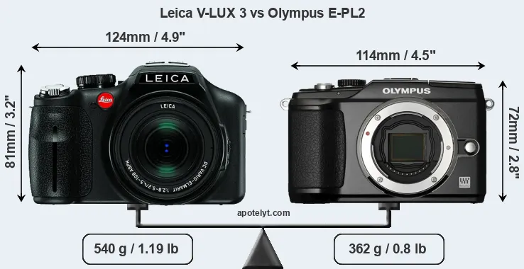 The side-by-side display below illustrates the physical size and weight of the Leica V-LUX 3 and the Olympus E-PL2. The two cameras are presented according to their relative size. Three consecutive perspectives from the front, the top, and the back are available. All width, height and depth measures are rounded to the nearest millimeter.