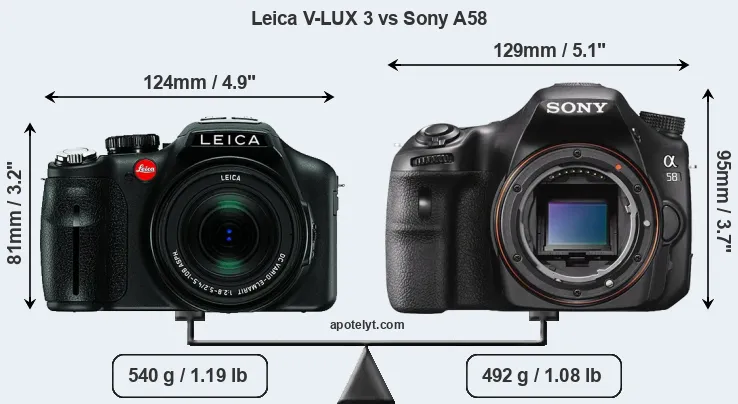 An illustration of the physical size and weight of the Leica V-LUX 3 and the Sony A58 is provided in the side-by-side display below. The two cameras are presented according to their relative size. Three consecutive perspectives from the front, the top, and the back are available. All size dimensions are rounded to the nearest millimeter.
