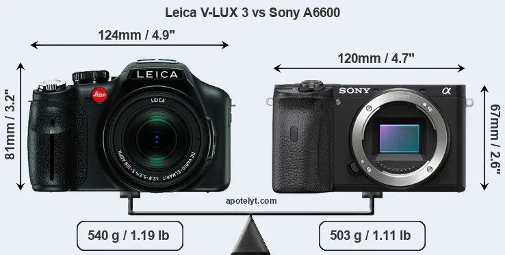 The side-by-side display below illustrates the physical size and weight of the Leica V-LUX 3 and the Sony A6600. The two cameras are presented according to their relative size. Three consecutive perspectives from the front, the top, and the back are available. All width, height and depth dimensions are rounded to the nearest millimeter.