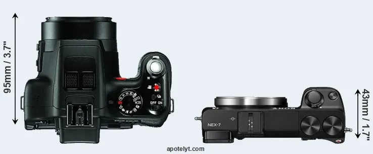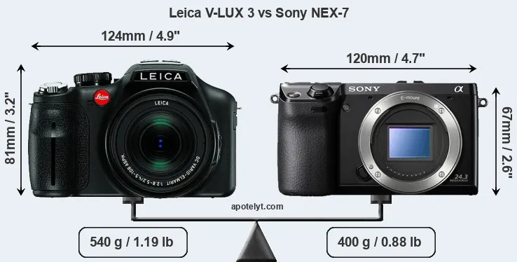 The side-by-side display below illustrates the physical size and weight of the Leica V-LUX 3 and the Sony NEX-7. The two cameras are presented according to their relative size. Three consecutive perspectives from the front, the top, and the back are available. All width, height and depth dimensions are rounded to the nearest millimeter.