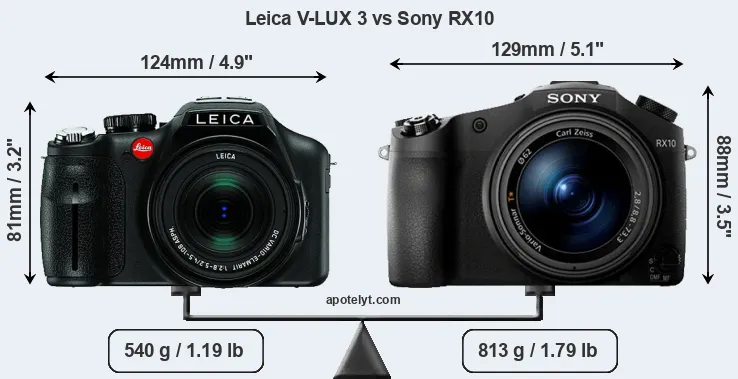 An illustration of the physical size and weight of the Leica V-LUX 3 and the Sony RX10 is provided in the side-by-side display below. The two cameras are presented according to their relative size. Three consecutive perspectives from the front, the top, and the back are available. All size dimensions are rounded to the nearest millimeter.