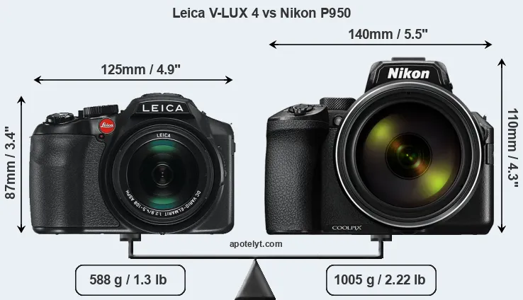 The side-by-side display below illustrates the physical size and weight of the Leica V-LUX 4 and the Nikon P950. The two cameras are presented according to their relative size. Three consecutive perspectives from the front, the top, and the back are available. All size dimensions are rounded to the nearest millimeter.