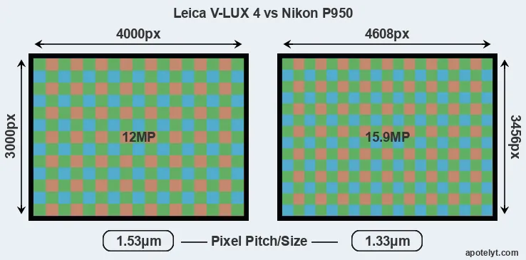 While the two cameras under review share the same sensor size, the P950 offers a higher resolution of 15.9 megapixels, compared with 12 MP of the V-LUX 4. This megapixels advantage translates into a 15 percent gain in linear resolution. On the other hand, these sensor specs imply that the P950 has a higher pixel density and a smaller size of the individual pixel (with a pixel pitch of 1.33μm versus 1.53μm for the V-LUX 4). However, it should be noted that the P950 is much more recent (by 7 years and 3 months) than the V-LUX 4, and its sensor will have benefitted from technological advances during this time that compensate for the smaller pixel size. Coming back to sensor resolution, it should be mentioned that neither of the two cameras has an anti-alias filter installed, so they are able to capture all the detail the sensor resolves.