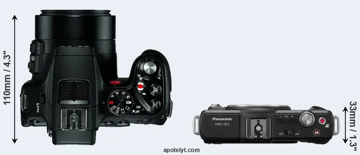 An illustration of the physical size and weight of the Leica V-LUX 4 and the Panasonic GF2 is provided in the side-by-side display below. The two cameras are presented according to their relative size. Three successive views from the front, the top, and the rear are shown. All width, height and depth dimensions are rounded to the nearest millimeter.