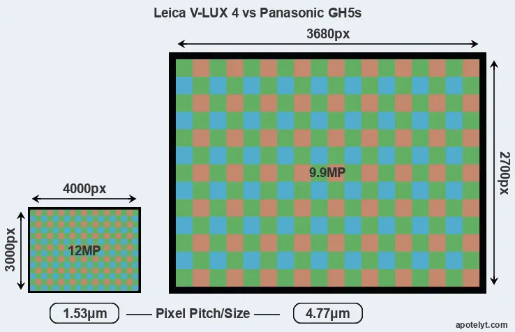 Despite having a smaller sensor, the Leica V-LUX 4 offers a higher resolution of 12 megapixels, compared with 9.9 MP of the Panasonic GH5s. This megapixels advantage comes at the cost of a higher pixel density and a smaller size of the individual pixel (with a pixel pitch of 1.53μm versus 4.77μm for the GH5s). Moreover, it should be noted that the GH5s is much more recent (by 5 years and 3 months) than the V-LUX 4, and its sensor will have benefitted from technological advances during this time that further enhance the light gathering capacity of its pixel-units. Coming back to sensor resolution, it should be mentioned that neither of the two cameras has an anti-alias filter installed, so they are able to capture all the detail the sensor resolves.