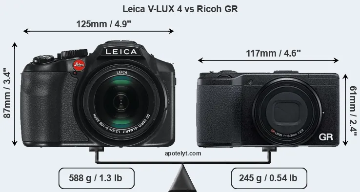 The side-by-side display below illustrates the physical size and weight of the Leica V-LUX 4 and the Ricoh GR. The two cameras are presented according to their relative size. Three consecutive views from the front, the top, and the rear side are shown. All width, height and depth measures are rounded to the nearest millimeter.
