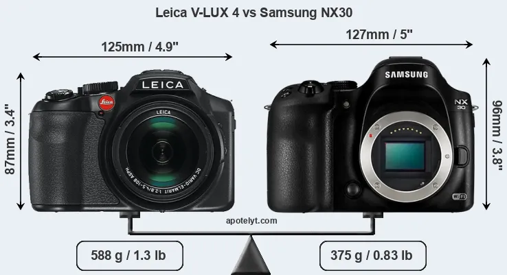 The side-by-side display below illustrates the physical size and weight of the Leica V-LUX 4 and the Samsung NX30. The two cameras are presented according to their relative size. Three consecutive perspectives from the front, the top, and the back are available. All width, height and depth measures are rounded to the nearest millimeter.
