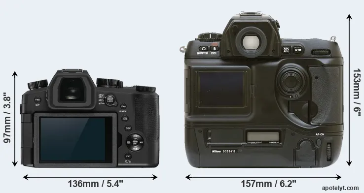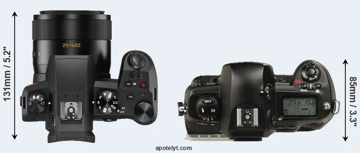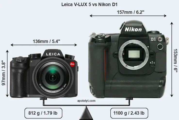 If the front view area (width x height) of the cameras is taken as an aggregate measure of their size, the Nikon D1 is considerably larger (82 percent) than the Leica V-LUX 5. It is noteworthy in this context that the D1 is splash and dust-proof, while the V-LUX 5 does not feature any corresponding weather-sealing.