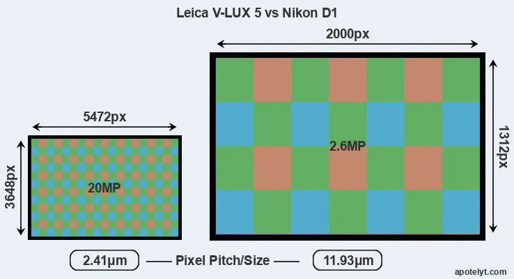 Despite having a smaller sensor, the Leica V-LUX 5 offers a higher resolution of 20 megapixels, compared with 2.6 MP of the Nikon D1. This megapixels advantage comes at the cost of a higher pixel density and a smaller size of the individual pixel (with a pixel pitch of 2.41μm versus 11.93μm for the D1). However, it should be noted that the V-LUX 5 is much more recent (by 20 years) than the D1, and its sensor will have benefitted from technological advances during this time that make it possible to gather light more efficiently.
