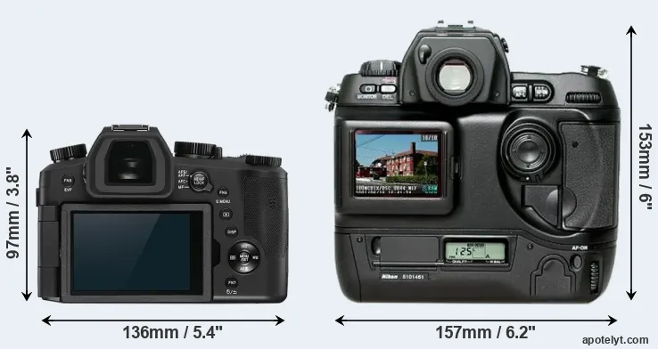 If the front view area (width x height) of the cameras is taken as an aggregate measure of their size, the Nikon D1H is considerably larger (82 percent) than the Leica V-LUX 5. It is noteworthy in this context that the D1H is splash and dust-proof, while the V-LUX 5 does not feature any corresponding weather-sealing.
