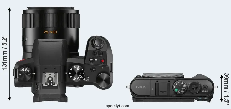 The physical size and weight of the Leica V-LUX 5 and the Olympus E-PL10 are illustrated in the side-by-side display below. The two cameras are presented according to their relative size. Three successive views from the front, the top, and the rear are shown. All size dimensions are rounded to the nearest millimeter.
