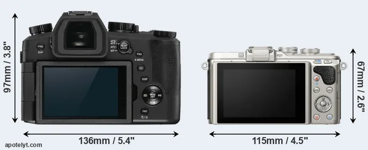 The side-by-side display below illustrates the physical size and weight of the Leica V-LUX 5 and the Olympus E-PL8. The two cameras are presented according to their relative size. Three successive views from the front, the top, and the rear are shown. All size dimensions are rounded to the nearest millimeter.