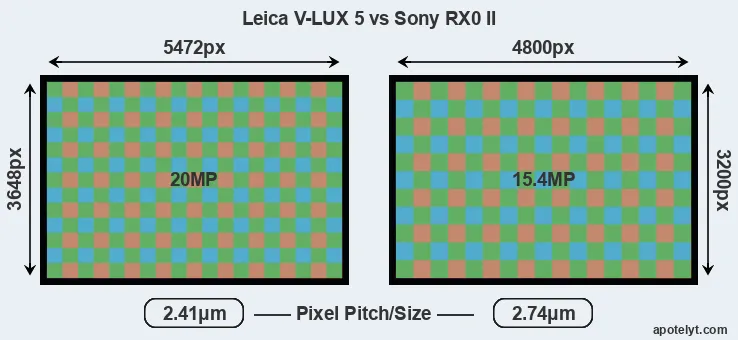 While the two cameras under review share the same sensor size, the V-LUX 5 offers a higher resolution of 20 megapixels, compared with 15.4 MP of the RX0 II. This megapixels advantage translates into a 14 percent gain in linear resolution. On the other hand, these sensor specs imply that the V-LUX 5 has a higher pixel density and a smaller size of the individual pixel (with a pixel pitch of 2.41μm versus 2.74μm for the RX0 II). In this context, it should be noted, however, that the V-LUX 5 is a somewhat more recent model (by 3 months) than the RX0 II, and its sensor might have benefitted from technological advances during this time that at least partly compensate for the smaller pixel size.