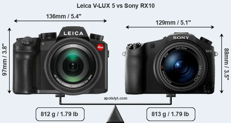 An illustration of the physical size and weight of the Leica V-LUX 5 and the Sony RX10 is provided in the side-by-side display below. The two cameras are presented according to their relative size. Three consecutive views from the front, the top, and the rear side are shown. All width, height and depth measures are rounded to the nearest millimeter.