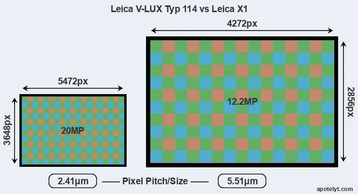 Despite having a smaller sensor, the Leica V-LUX Typ 114 offers a higher resolution of 20 megapixels, compared with 12.2 MP of the Leica X1. This megapixels advantage comes at the cost of a higher pixel density and a smaller size of the individual pixel (with a pixel pitch of 2.41μm versus 5.51μm for the X1). However, it should be noted that the V-LUX Typ 114 is much more recent (by 5 years) than the X1, and its sensor will have benefitted from technological advances during this time that make it possible to gather light more efficiently.