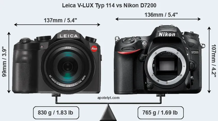 An illustration of the physical size and weight of the Leica V-LUX Typ 114 and the Nikon D7200 is provided in the side-by-side display below. The two cameras are presented according to their relative size. Three consecutive perspectives from the front, the top, and the back are available. All size dimensions are rounded to the nearest millimeter.