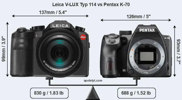 An illustration of the physical size and weight of the Leica V-LUX Typ 114 and the Pentax K-70 is provided in the side-by-side display below. The two cameras are presented according to their relative size. Three consecutive views from the front, the top, and the rear side are shown. All size dimensions are rounded to the nearest millimeter.