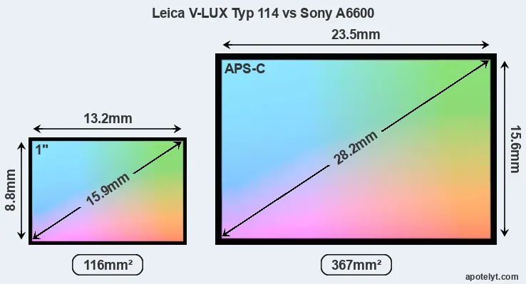 Of the two cameras under consideration, the Leica V-LUX Typ 114 features an one-inch sensor and the Sony A6600 an APS-C sensor. The sensor area in the A6600 is 216 percent bigger. As a result of these sensor size differences, the cameras have a format factor of, respectively, 2.7 and 1.5. Both cameras have a native aspect ratio (sensor width to sensor height) of 3:2.