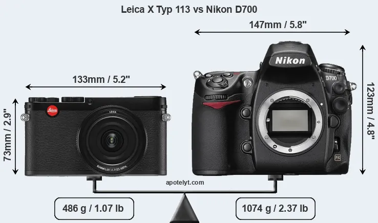 An illustration of the physical size and weight of the Leica X Typ 113 and the Nikon D700 is provided in the side-by-side display below. The two cameras are presented according to their relative size. Three consecutive perspectives from the front, the top, and the back are available. All width, height and depth dimensions are rounded to the nearest millimeter.