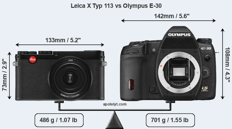 If the front view area (width x height) of the cameras is taken as an aggregate measure of their size, the Olympus E-30 is considerably larger (58 percent) than the Leica X Typ 113. In this context, it is worth noting that neither the X Typ 113 nor the E-30 are weather-sealed.