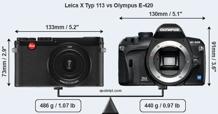 The side-by-side display below illustrates the physical size and weight of the Leica X Typ 113 and the Olympus E-420. The two cameras are presented according to their relative size. Three consecutive perspectives from the front, the top, and the back are available. All width, height and depth measures are rounded to the nearest millimeter.