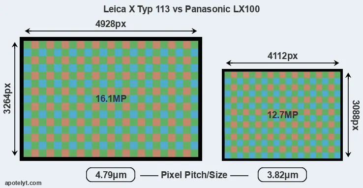 With 16.1MP, the X Typ 113 offers a higher resolution than the LX100 (12.7MP), but the X Typ 113 nevertheless has larger individual pixels (pixel pitch of 4.79μm versus 3.82μm for the LX100) due to its larger sensor. It is noteworthy in this context that the two cameras were released in close succession, so that their sensors are from the same technological generation.