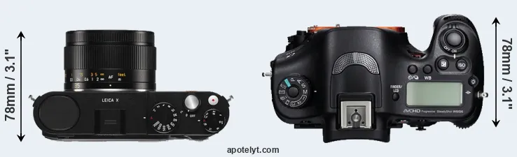The physical size and weight of the Leica X Typ 113 and the Sony A99 are illustrated in the side-by-side display below. The two cameras are presented according to their relative size. Three consecutive views from the front, the top, and the rear side are shown. All width, height and depth dimensions are rounded to the nearest millimeter.