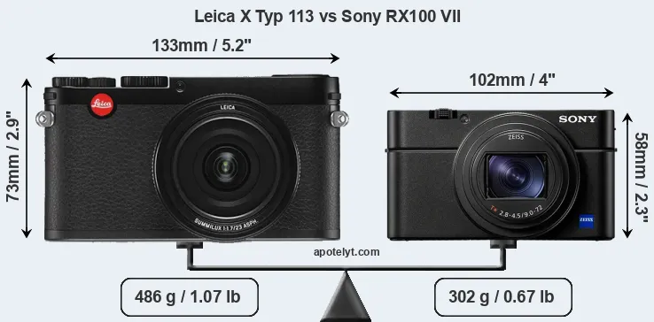 If the front view area (width x height) of the cameras is taken as an aggregate measure of their size, the Sony RX100 VII is considerably smaller (39 percent) than the Leica X Typ 113. Moreover, the RX100 VII is substantially lighter (38 percent) than the X Typ 113. In this context, it is worth noting that neither the X Typ 113 nor the RX100 VII are weather-sealed.