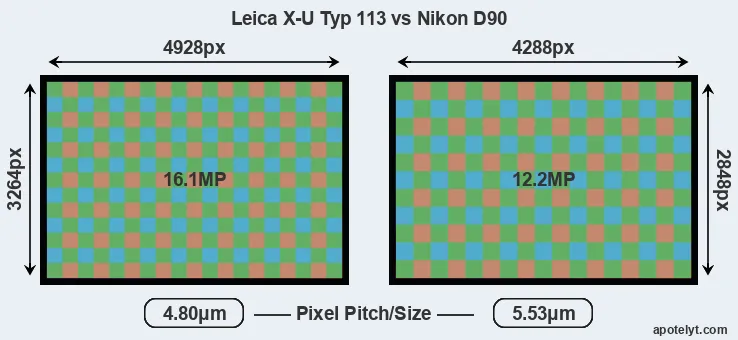 Despite having a slightly smaller sensor, the Leica X-U Typ 113 offers a higher resolution of 16.1 megapixels, compared with 12.2 MP of the Nikon D90. This megapixels advantage comes at the cost of a higher pixel density and a smaller size of the individual pixel (with a pixel pitch of 4.80μm versus 5.53μm for the D90). However, it should be noted that the X-U Typ 113 is much more recent (by 7 years and 4 months) than the D90, and its sensor will have benefitted from technological advances during this time that make it possible to gather light more efficiently.