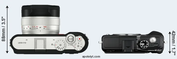 An illustration of the physical size and weight of the Leica X-U Typ 113 and the Olympus E-PL2 is provided in the side-by-side display below. The two cameras are presented according to their relative size. Three successive views from the front, the top, and the rear are shown. All width, height and depth dimensions are rounded to the nearest millimeter.