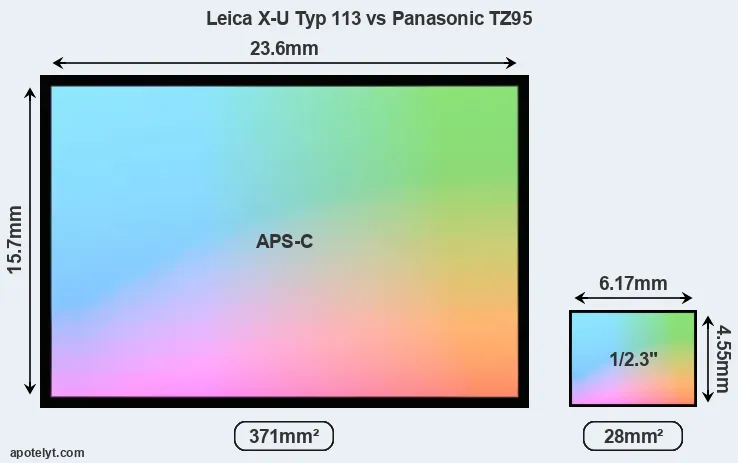 Of the two cameras under consideration, the Leica X-U Typ 113 features an APS-C sensor and the Panasonic TZ95 a 1/2.3-inch sensor. The sensor area in the TZ95 is 92 percent smaller. As a result of these sensor size differences, the cameras have a format factor of, respectively, 1.5 and 5.6. The sensor in the X-U Typ 113 has a native 3:2 aspect ratio, while the one in the TZ95 offers a 4:3 aspect.