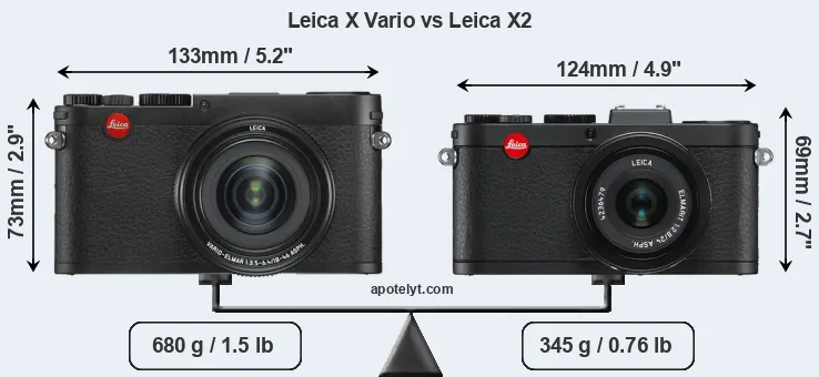 If the front view area (width x height) of the cameras is taken as an aggregate measure of their size, the Leica X2 is notably smaller (12 percent) than the Leica X Vario. Moreover, the X2 is substantially lighter (49 percent) than the X Vario. In this context, it is worth noting that neither the X Vario nor the X2 are weather-sealed.