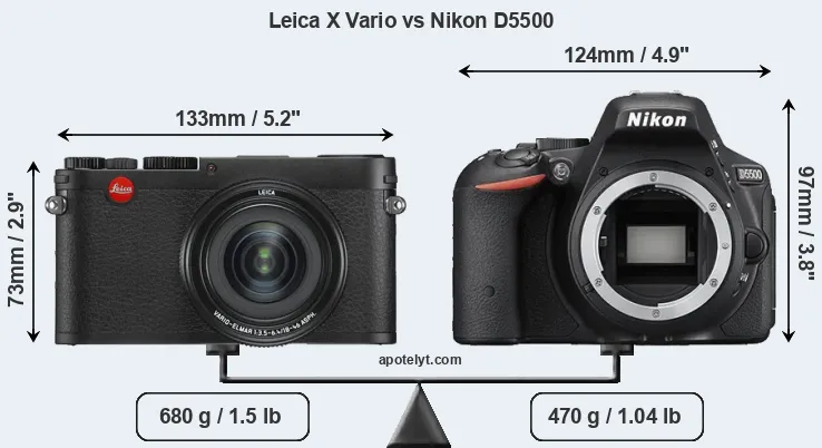If the front view area (width x height) of the cameras is taken as an aggregate measure of their size, the Nikon D5500 is notably larger (24 percent) than the Leica X Vario. In this context, it is worth noting that neither the X Vario nor the D5500 are weather-sealed.