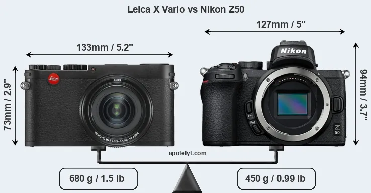 If the front view area (width x height) of the cameras is taken as an aggregate measure of their size, the Nikon Z50 is notably larger (23 percent) than the Leica X Vario. It is noteworthy in this context that the Z50 is splash and dust-proof, while the X Vario does not feature any corresponding weather-sealing.