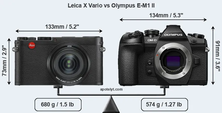 An illustration of the physical size and weight of the Leica X Vario and the Olympus E-M1 II is provided in the side-by-side display below. The two cameras are presented according to their relative size. Three consecutive perspectives from the front, the top, and the back are available. All width, height and depth dimensions are rounded to the nearest millimeter.