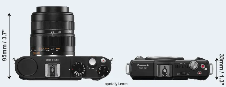 The side-by-side display below illustrates the physical size and weight of the Leica X Vario and the Panasonic GF2. The two cameras are presented according to their relative size. Three consecutive perspectives from the front, the top, and the back are available. All width, height and depth measures are rounded to the nearest millimeter.