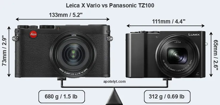 If the front view area (width x height) of the cameras is taken as an aggregate measure of their size, the Panasonic TZ100 is notably smaller (26 percent) than the Leica X Vario. Moreover, the TZ100 is substantially lighter (54 percent) than the X Vario. In this context, it is worth noting that neither the X Vario nor the TZ100 are weather-sealed.