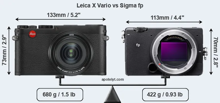 The Leica X Vario (Typ 107) and the Sigma fp are two digital cameras that were officially introduced, respectively, in June 2013 and July 2019. The X Vario is a fixed lens compact, while the fp is a mirrorless interchangeable lens camera. The cameras are based on an APS-C (X Vario) and a full frame (fp) sensor. The Leica has a resolution of 16.1 megapixels, whereas the Sigma provides 24 MP.