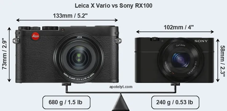If the front view area (width x height) of the cameras is taken as an aggregate measure of their size, the Sony RX100 is considerably smaller (39 percent) than the Leica X Vario. Moreover, the RX100 is substantially lighter (65 percent) than the X Vario. In this context, it is worth noting that neither the X Vario nor the RX100 are weather-sealed.
