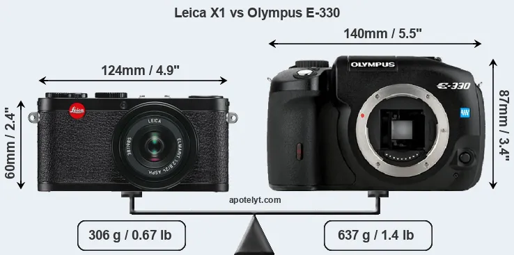 If the front view area (width x height) of the cameras is taken as an aggregate measure of their size, the Olympus E-330 is considerably larger (64 percent) than the Leica X1. In this context, it is worth noting that neither the X1 nor the E-330 are weather-sealed.