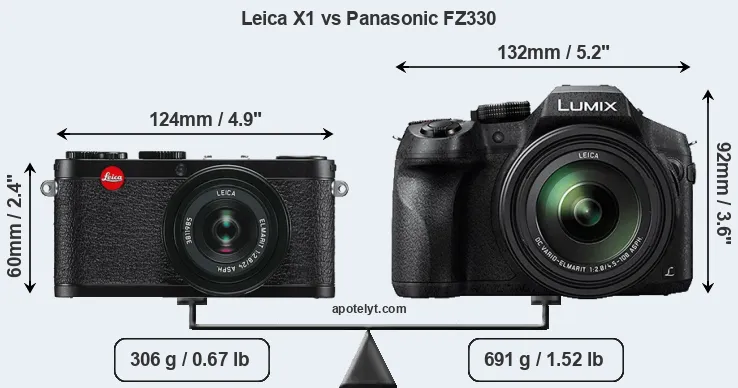 If the front view area (width x height) of the cameras is taken as an aggregate measure of their size, the Panasonic FZ330 is considerably larger (63 percent) than the Leica X1. Moreover, the FZ330 is substantially heavier (126 percent) than the X1. It is noteworthy in this context that the FZ330 is splash and dust-proof, while the X1 does not feature any corresponding weather-sealing.