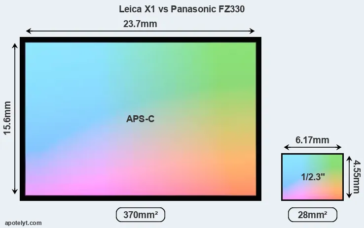 Of the two cameras under consideration, the Leica X1 features an APS-C sensor and the Panasonic FZ330 a 1/2.3-inch sensor. The sensor area in the FZ330 is 92 percent smaller. As a result of these sensor size differences, the cameras have a format factor of, respectively, 1.5 and 5.6. The sensor in the X1 has a native 3:2 aspect ratio, while the one in the FZ330 offers a 4:3 aspect.