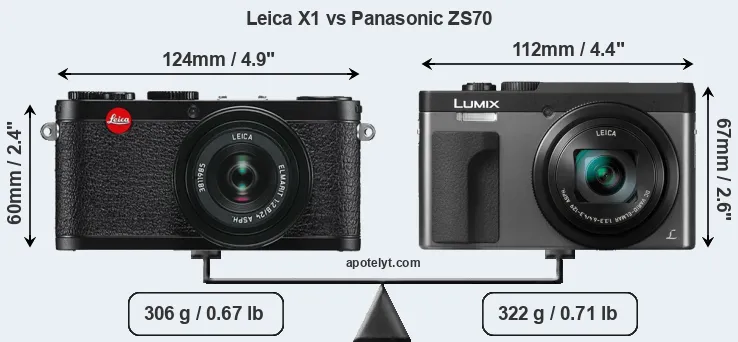 If the front view area (width x height) of the cameras is taken as an aggregate measure of their size, the Leica X1 and the Panasonic ZS70 are of equal size. However, the ZS70 is markedly heavier (5 percent) than the X1. In this context, it is worth noting that neither the X1 nor the ZS70 are weather-sealed.