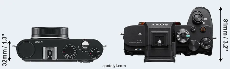 The physical size and weight of the Leica X1 and the Sony A7S III are illustrated in the side-by-side display below. The two cameras are presented according to their relative size. Three successive views from the front, the top, and the rear are shown. All width, height and depth measures are rounded to the nearest millimeter.