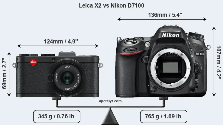 If the front view area (width x height) of the cameras is taken as an aggregate measure of their size, the Nikon D7100 is considerably larger (70 percent) than the Leica X2. It is noteworthy in this context that the D7100 is splash and dust-proof, while the X2 does not feature any corresponding weather-sealing.