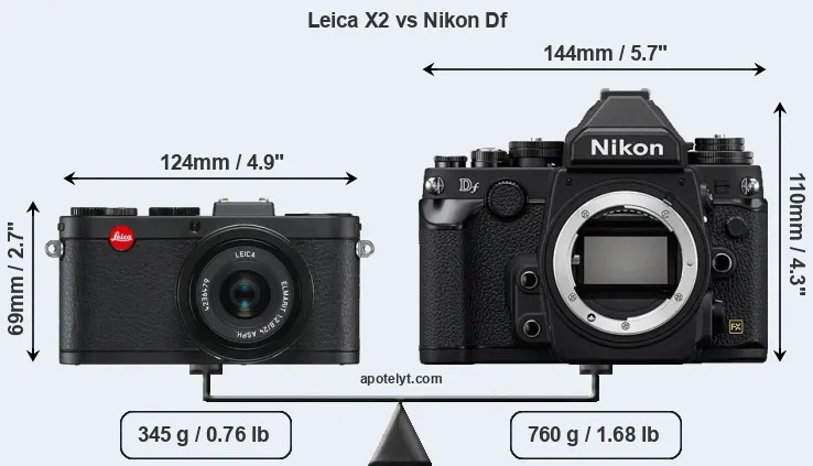If the front view area (width x height) of the cameras is taken as an aggregate measure of their size, the Nikon Df is considerably larger (85 percent) than the Leica X2. It is noteworthy in this context that the Df is splash and dust-proof, while the X2 does not feature any corresponding weather-sealing.