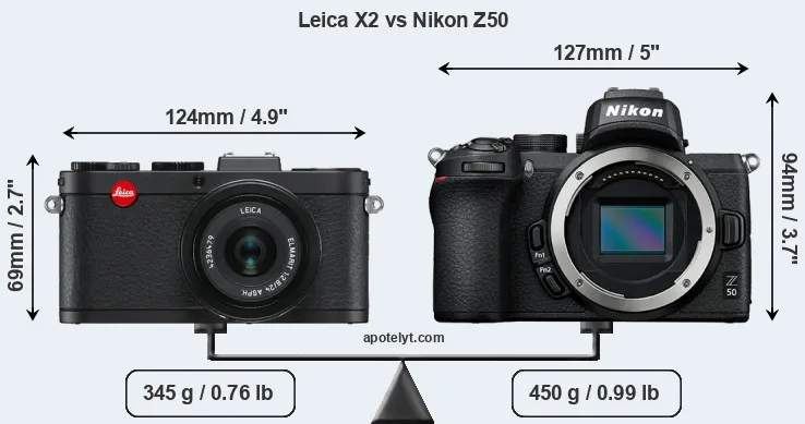 An illustration of the physical size and weight of the Leica X2 and the Nikon Z50 is provided in the side-by-side display below. The two cameras are presented according to their relative size. Three successive views from the front, the top, and the rear are shown. All width, height and depth dimensions are rounded to the nearest millimeter.