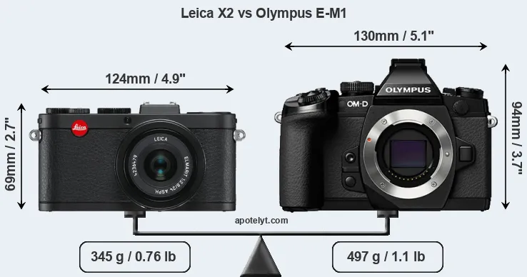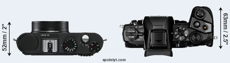 If the front view area (width x height) of the cameras is taken as an aggregate measure of their size, the Olympus E-M1 is considerably larger (43 percent) than the Leica X2. It is noteworthy in this context that the E-M1 is splash and dust-proof, while the X2 does not feature any corresponding weather-sealing.