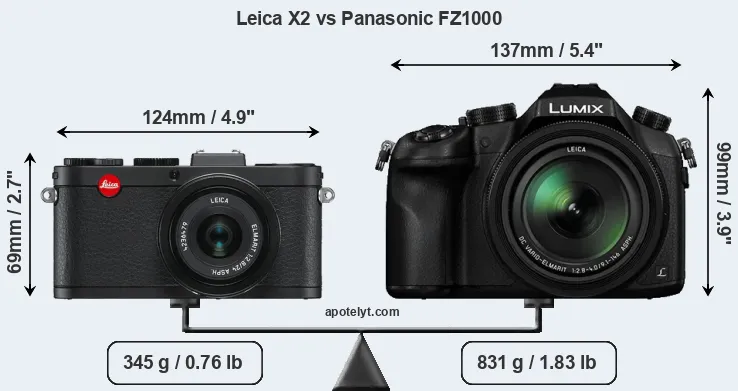 If the front view area (width x height) of the cameras is taken as an aggregate measure of their size, the Panasonic FZ1000 is considerably larger (59 percent) than the Leica X2. Moreover, the FZ1000 is substantially heavier (141 percent) than the X2. In this context, it is worth noting that neither the X2 nor the FZ1000 are weather-sealed.